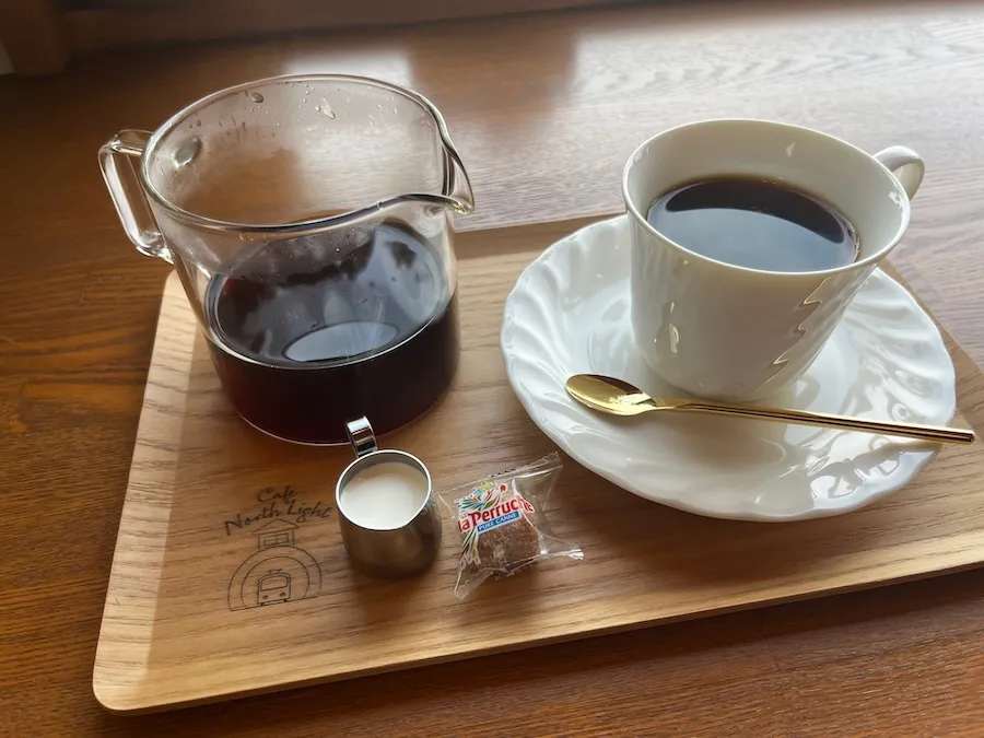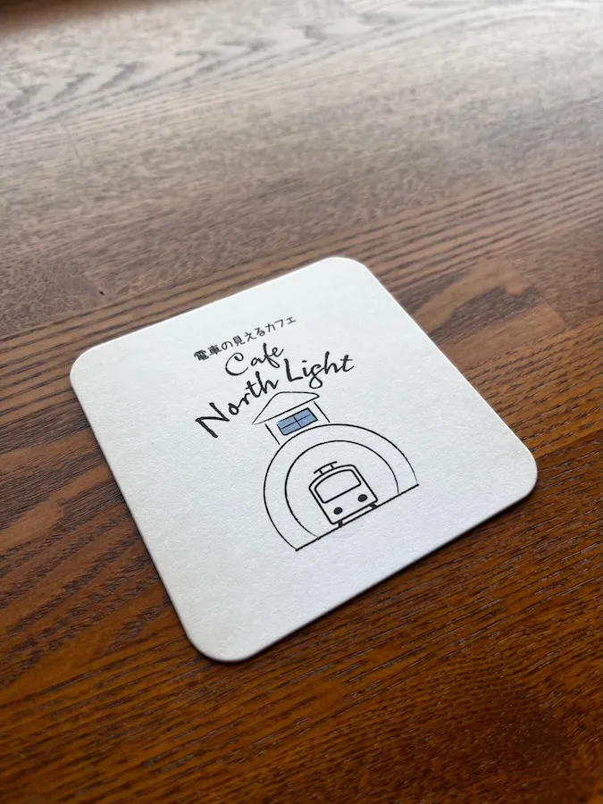 プレート、コースターの『電車の見えるカフェ North Light』のロゴマークが素敵です。 マスターがていねいに淹れてくださる美味しい珈琲や紅茶、 そして手作りのケーキをゆっくりと楽しめます。