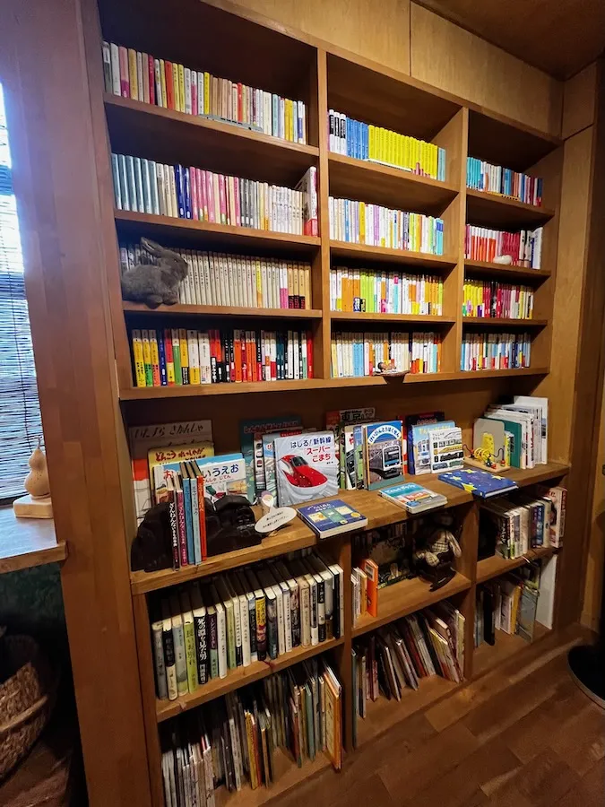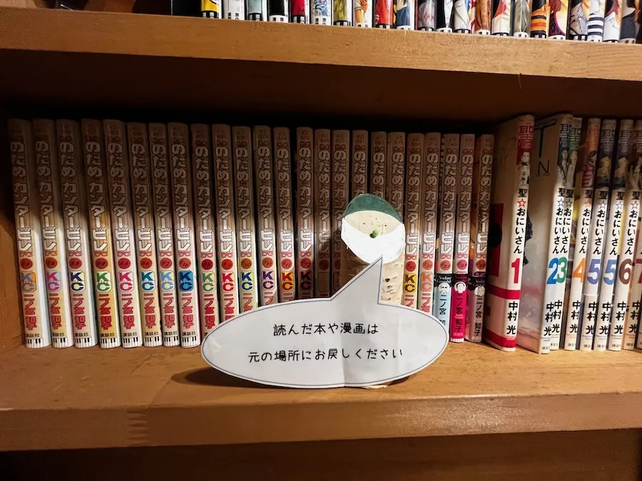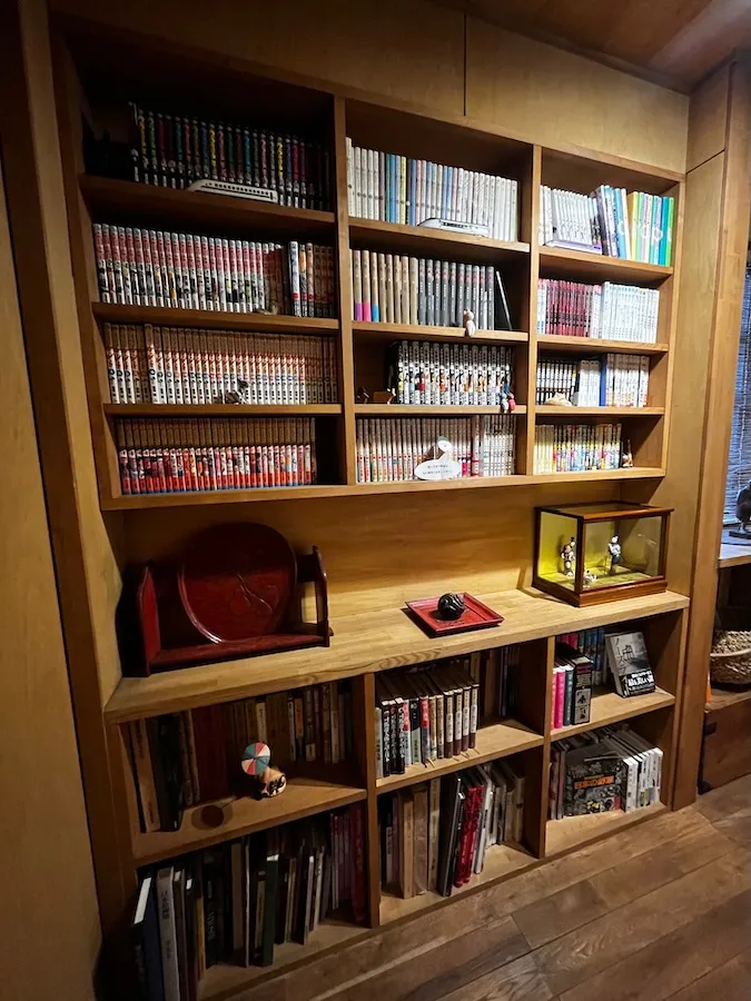 さらに進んでいくと大きな本棚が2つ。 ご主人に聞いたところ、こちらは「それぞれの趣味で集められている」というお二人の蔵書たち。 そのラインナップは様々で、漫画も小説も絵本もあり、ずらりと並んでいます!! カフェスペースに持ち込んで自由に読むことが出来ます。