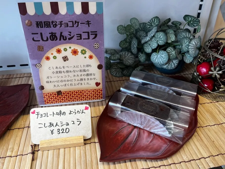 そして、チョコレート味の羊羹「こしあんショコラ」という変わり種を発見! 上品な甘さのこし餡をベースに、チョコレートやココアを加えてつくった濃厚な和風ガトーショコラ。