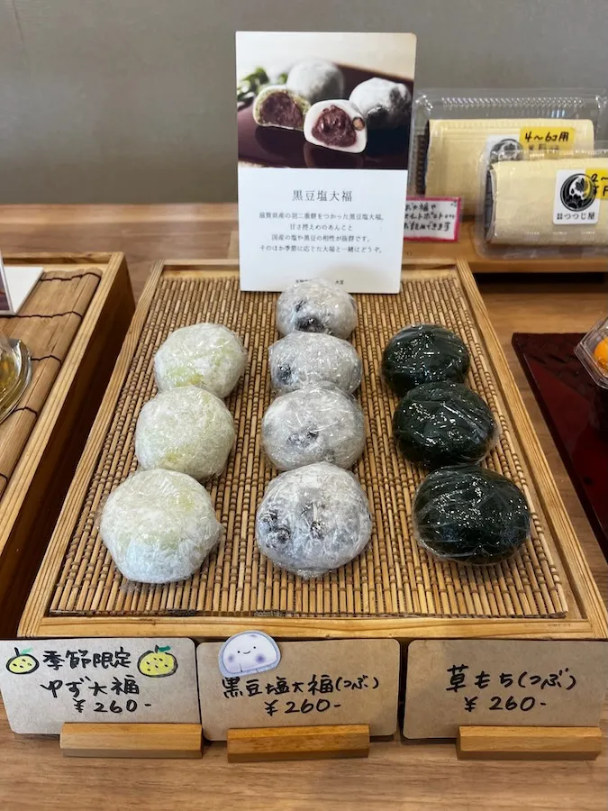 こちらは、定番の豆大福や草餅。そして、冬季限定でゆず大福が並んでいました。 ゆず大福は、もちもち柔らかい羽二重餅の中に、 柚子の皮が香るゆず風味の白あんが入っている、とても爽やかな味。