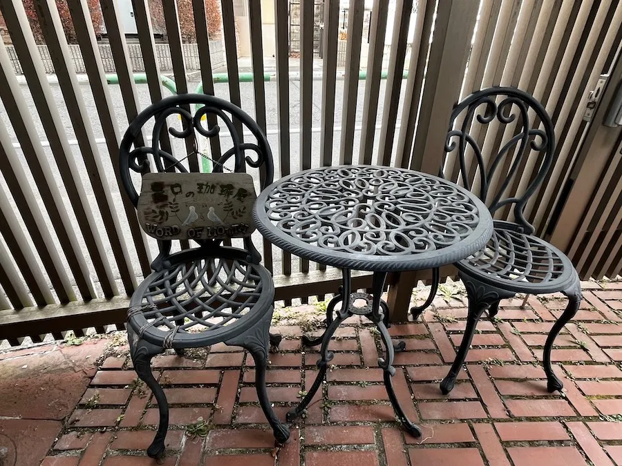 お店の前にテラス席のように並んでいる机と椅子には、手書きの看板が掛かっています。