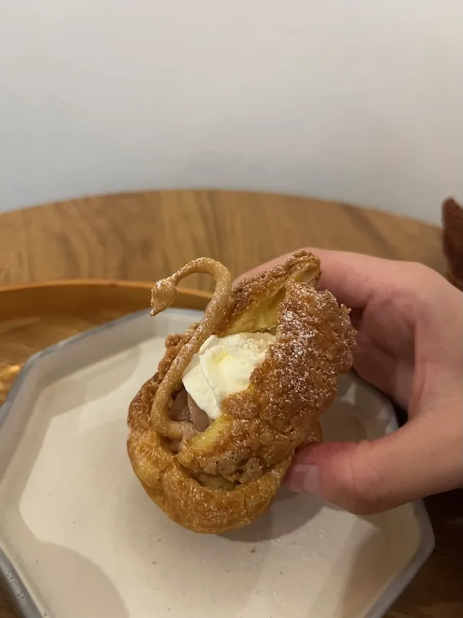 結局心苦しいですが、羽を一枚ずつもいでクリームをつけていただきました。 しっとりしたシュー生地にいちごチョコレート味のカスタードと生クリームが挟まっています。 白鳥の頭の部分は、クッキーくらいサクサクしていて食感の違いが楽しいです!