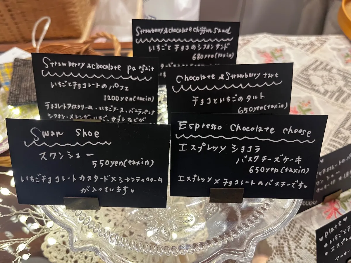 その他単品で頼めるものには、「スワンシュー」「いちごとチョコレートのパフェ」、 「いちごとチョコのシフォンサンド」、「エスプレッソバスクチーズケーキ」がありました。