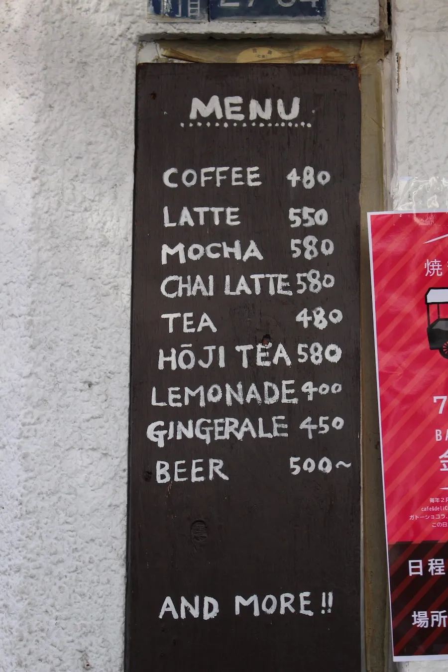 看板にはドリンクメニューが掲示されていました。 コーヒー、紅茶だけでなく、レモネードやビールもあるなんて種類豊富です!