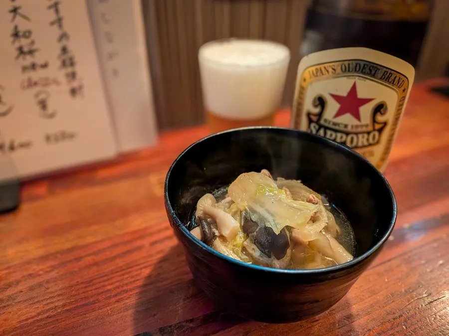 喉も潤ったところで、お通しをいただきますが、超ほっこり…! 鶏団子とお野菜から溢れ出す優しいお出汁がいい。