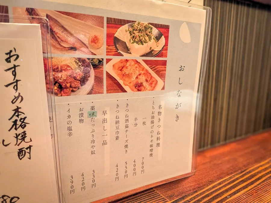 名物きつね料理には、 『きつね酒盗チーズ焼き』と『きつね納豆巾着』もあります! どちらも美味しそう…、次に来たときはどちらを食べようかな!