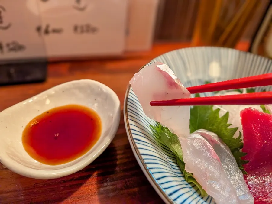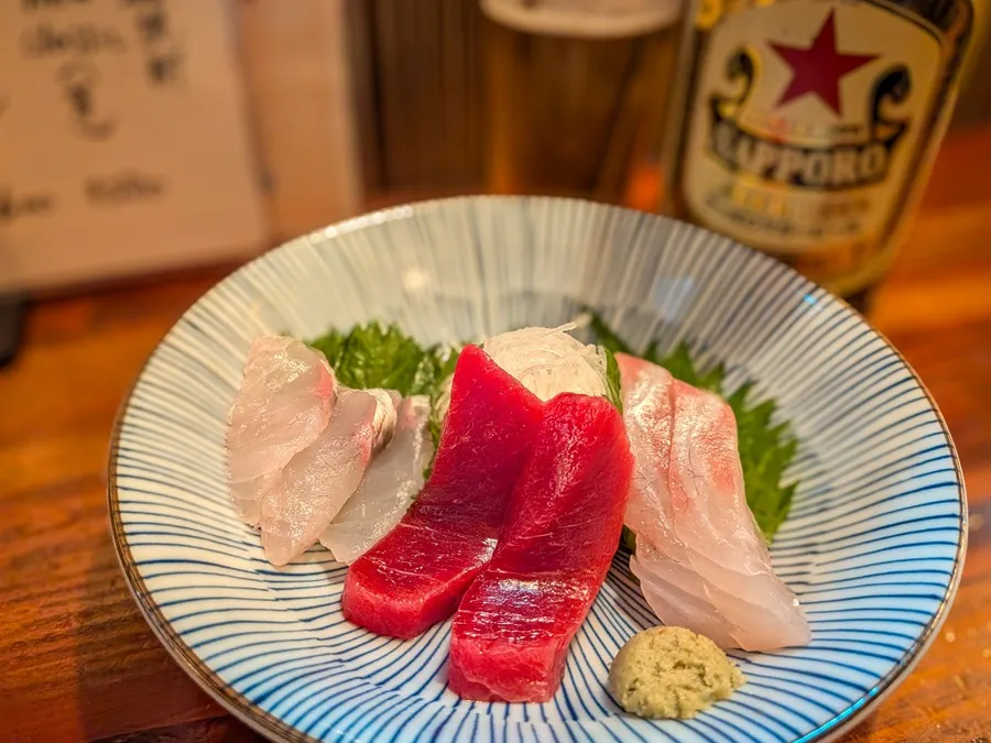 その前にいただくのはお刺身三点盛り。今宵のネタは、本マグロ、真鯛に真ゴチ。 1人で飲むことが多いあびこっちにとって、一人前から頼めるのはありがたい…。