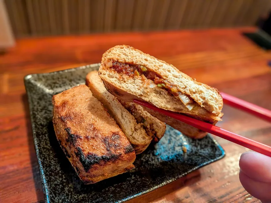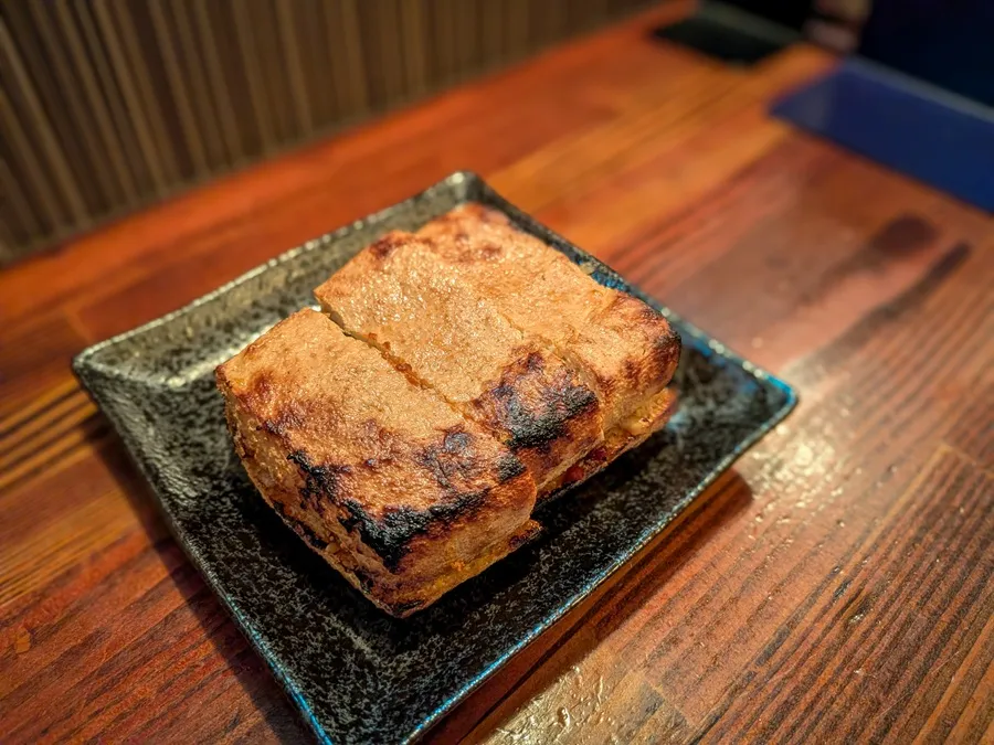 こうばしい香りとともにやってきました!『とちお油揚げのネギ味噌焼き』! サイズはお腹の具合に合わせて、半分か一枚かを選べます。