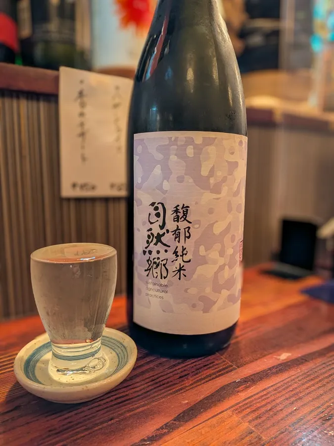 きつね料理で火がついてきましたので、ここで日本酒へ切り替えます。 まず一本目は福島県『自然郷 馥郁純米(ふくいくじゅんまい)』からいただきます。