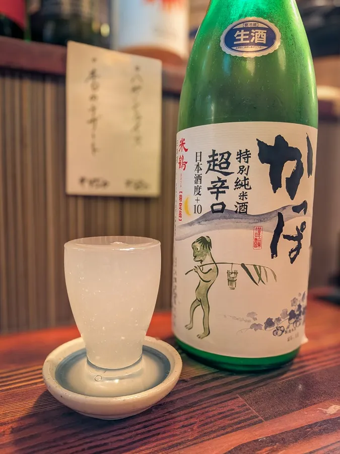 煮付けの上品な甘さに対抗するのは、やっぱりにごり酒ですかね! カッパのイラストが印象的な山形県『米鶴 かっぱ 特別純米 超辛口』を!