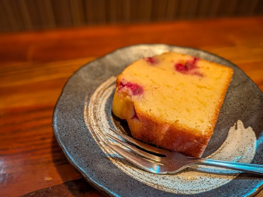 お腹もいい感じでしたので、本日のデザート『ラズベリーのパウンドケーキ』を。