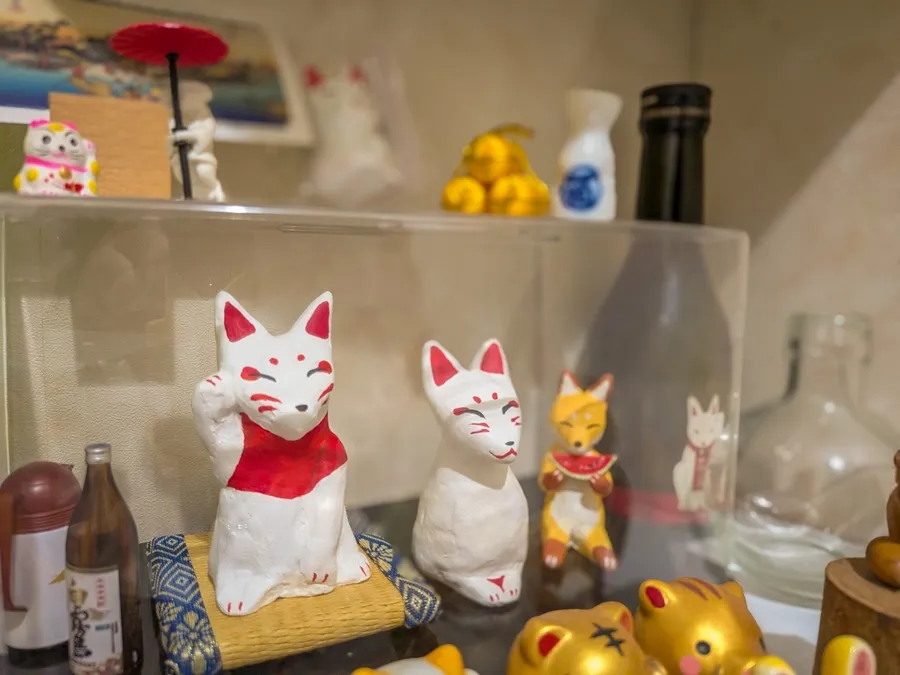 お父さんが上中里でお店を始めて14年経ちますが、 当時学生だった娘さんが狐が好きだったことから店名を狐灯にしたそうです。 お店の中にある集められた狐のオブジェの数が、それを物語っています。