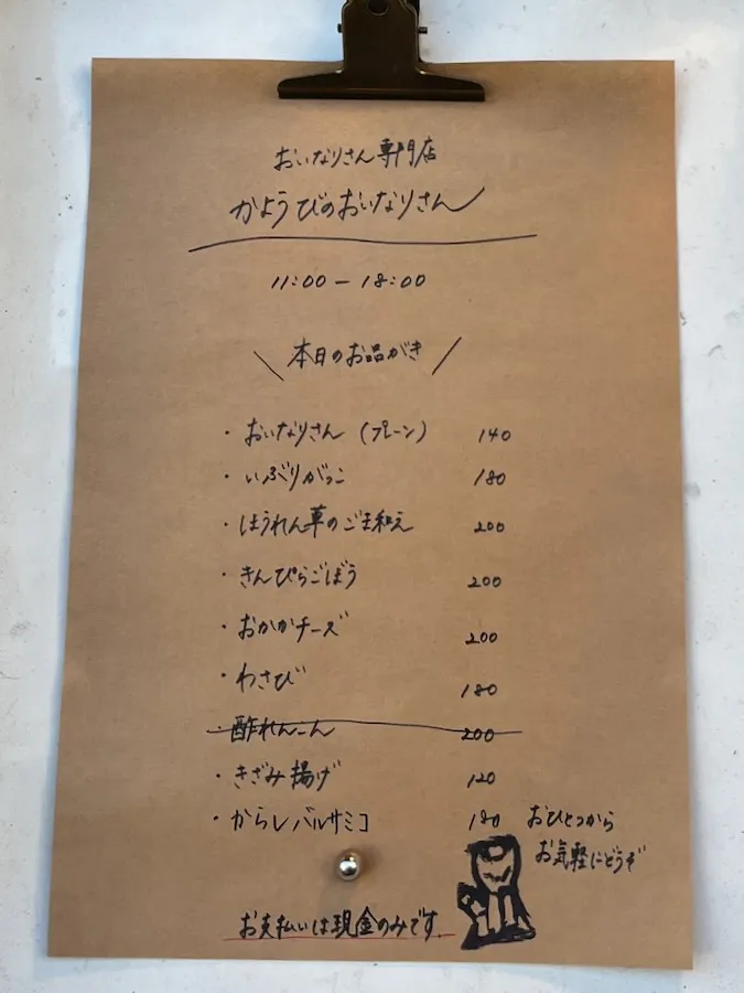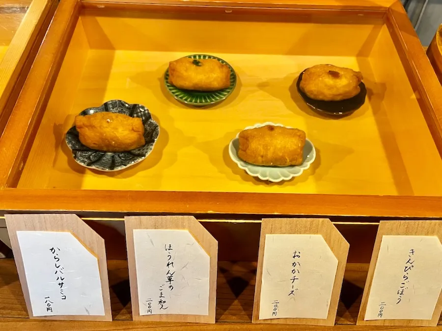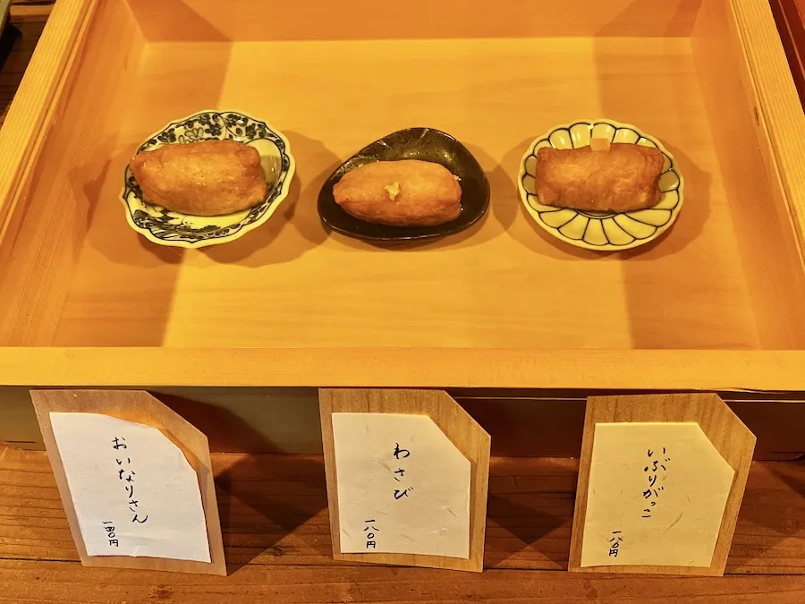 私が訪ねた日の「おいなりさんラインナップ」はこちら。 プレーンから、からしバルサミコ、いぶりがっこなど 普段あまりお目にかからないような変わり種まで豊富なメニュー!!